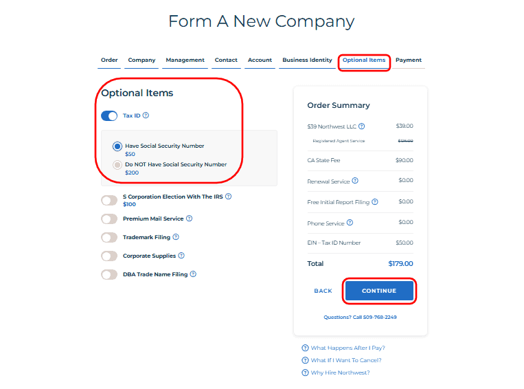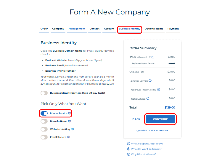 - Here, you can select optional business services such as a business phone, domain name, or email service. Select only what your business requires to stay lean and cost-efficient. In this example, the “Phone Service”