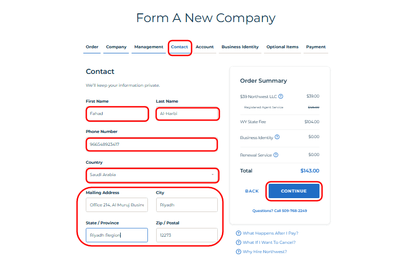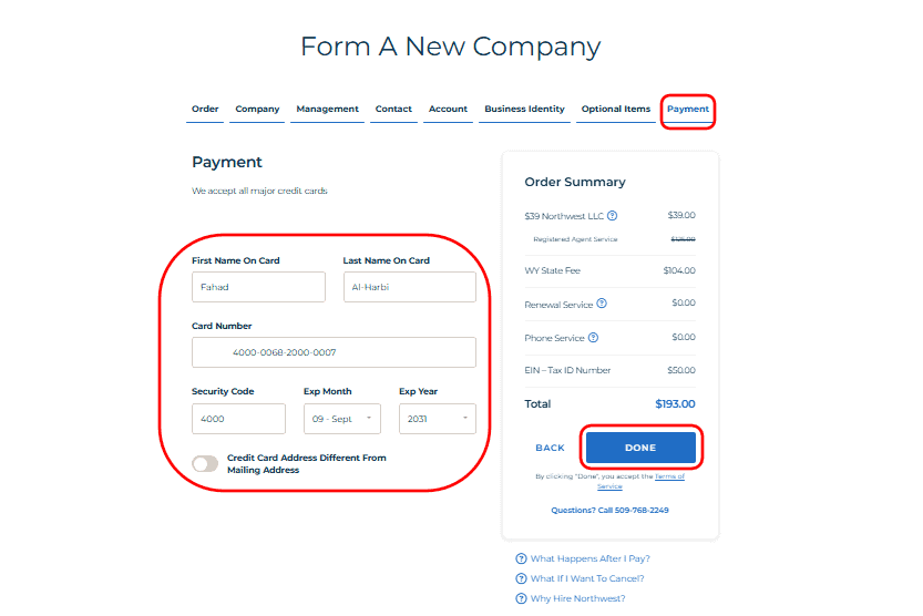 - This is the final checkout stage before your LLC is officially filed. Enter the Payment Information here.