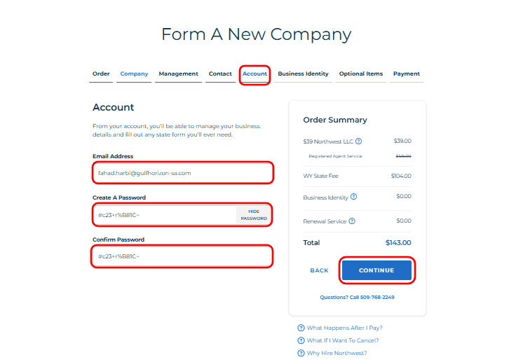 - In this step, enter your email address and create a strong password to manage your LLC details.
