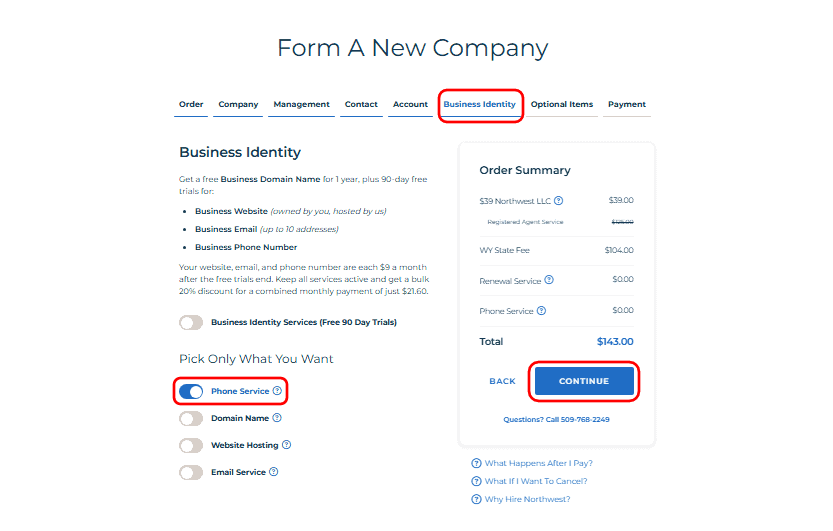 - Here, you can add optional business identity services, such as a business phone, domain name, or email service. Select only what your business requires to stay lean and cost-efficient. In this example, the Phone Service option is activated to maintain a professional business identity.