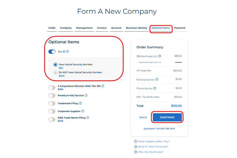 - On this page, you can choose additional services like obtaining an EIN (Tax ID). If you already have a Social Security Number, select the option Have Social Security Number. If not, formation partners can still help you obtain an EIN for a small additional fee.