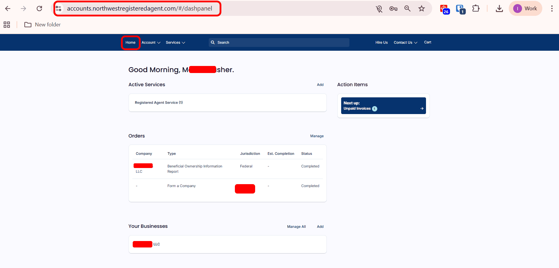 - After successful payment, you’ll be redirected to your registered agent dashboard. This secure online area displays your active services, orders, and status updates. You can monitor your LLC formation progress, access important compliance reminders, and receive updates when your business is officially approved.