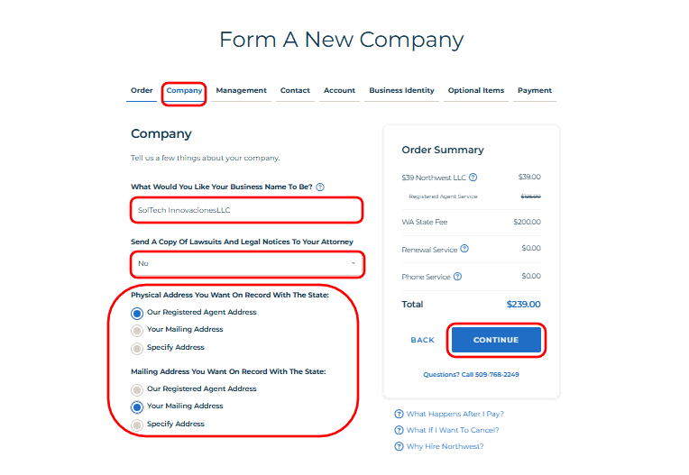 • Then choose Washington as the state where you want to form your company.