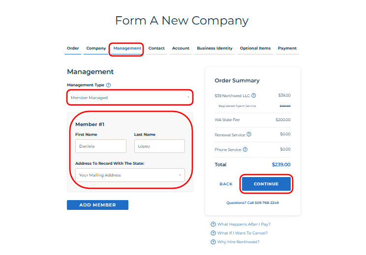 • Under Management Type, select Member-Managed if you want the owners to manage the business directly. Alternatively, choose Manager-Managed if your company will have appointed managers.