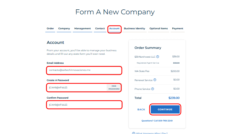 • In this step, enter your email address and create a strong password to manage your LLC details.