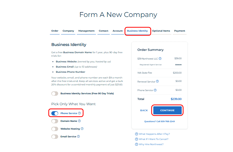 • Here, you can add optional business identity services, such as a business phone, domain name, or email service. Select only what your business requires to stay lean and cost-efficient. In this example, the Phone Service option is activated to maintain a professional business identity.