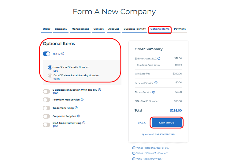 • On this page, you can choose additional services like obtaining an EIN (Tax ID). If you already have a Social Security Number, select the option Have Social Security Number. If not, formation partners can still help you obtain an EIN for a small additional fee.