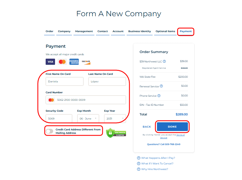 • This is the final checkout stage before your LLC is officially filed. Enter the Payment Information here.