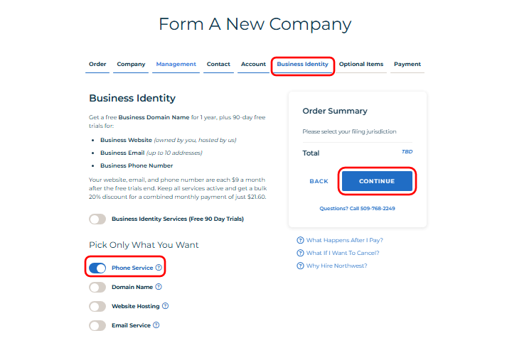 • Here, you can add optional business identity services, such as a business phone, domain name, or email service. Select only what your business requires to stay lean and cost-efficient. In this example, the Phone Service option is activated to maintain a professional business identity.