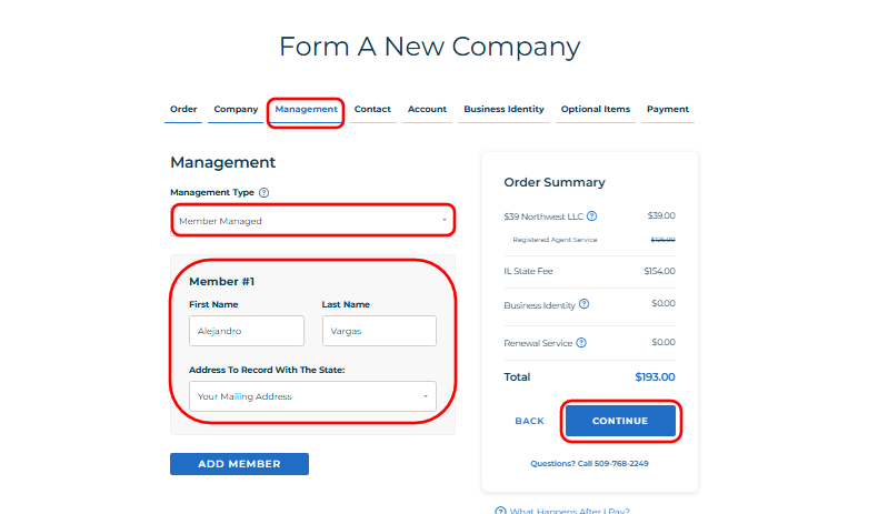 • Under Management Type, select Member-Managed if you want the owners to manage the business directly. Alternatively, choose Manager-Managed if your company will have appointed managers.