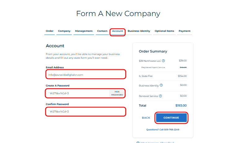 • In this step, enter your email address and create a strong password to manage your LLC details