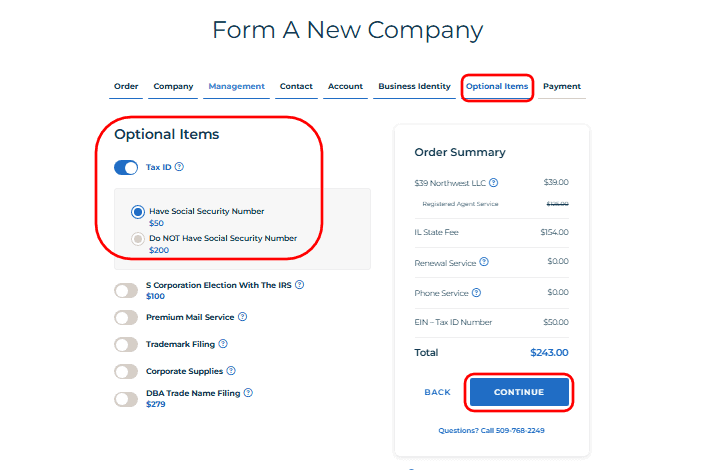 • On this page, you can choose additional services like obtaining an EIN (Tax ID). If you already have a Social Security Number, select the option Have Social Security Number. If not, formation partners can still help you obtain an EIN for a small additional fee.